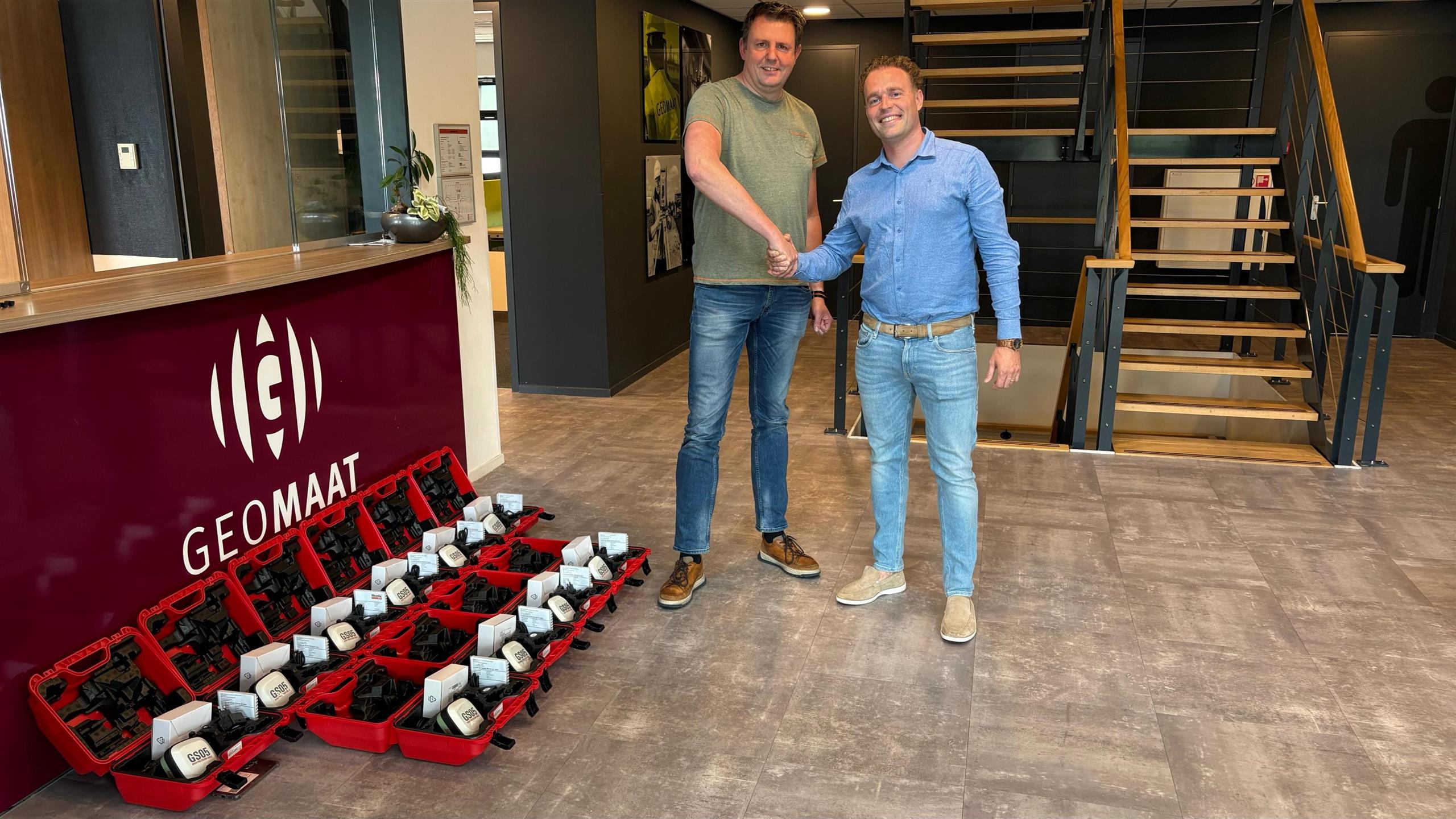 Foto: Wybe Rozenga, inkoper/materieelbeheerder Geomaat neemt de nieuwe Leica GSO5 Tiltrovers in ontvangst van senior accountmanager Mark Luijckx.